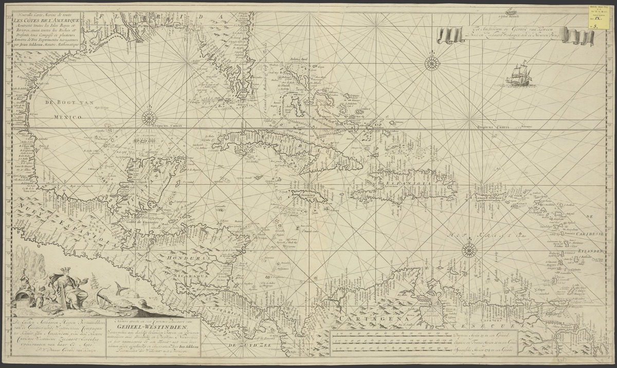 Nieuwe groote en seer curieuse paskaart van Geheel-Westindien, vertoonende alle desselfs eylanden bayen en rivieren mitsgaders alle droogtens en dieptens