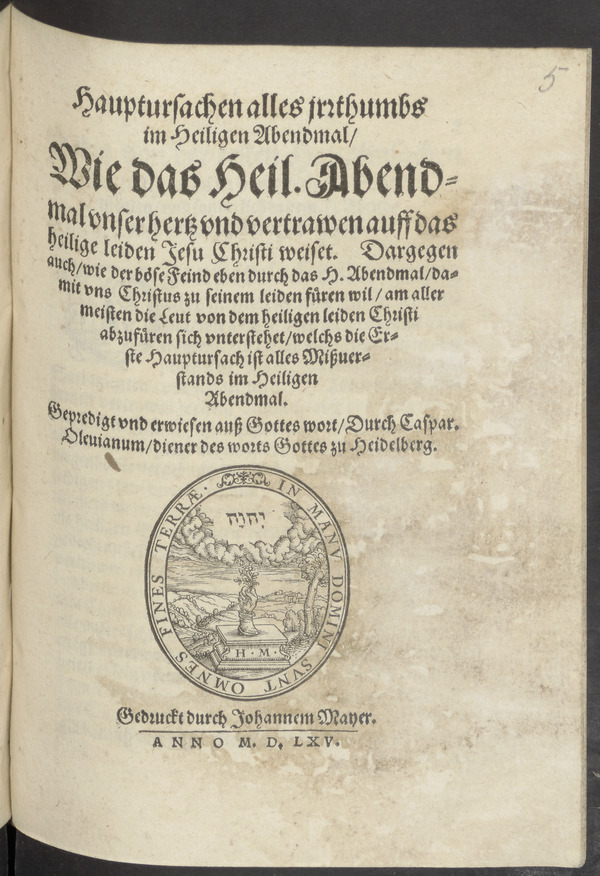 Hauptursachen alles Jrrthumbs im heiligen Abendmal, wie das heil. Abendmal vnser Hertz vnd Vertrawen auff das heilige Leiden Jesu Christi weiset. : Dargegen auch, wie der böse Feind eben durch das H. Abendmal, damit vns Christus zu seinem Leiden füren wil, am allermeisten die Leut von dem heiligen Leiden Christi abzufüren sich vnterstehet, welchs die erste Hauptursach ist alles Mißuerstands im heiligen Abendmal